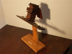 An exact 1/20 scale model of a satellite that has not flown yet helps to visualize the design. This one made in all walnut, with a few brass accents. The main panel at the base of the satellite is about 6 meters long in real life, making the model about 30 cm (~1 foot) long.
