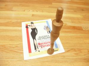 Multi-axis offset turning is more difficult than it seems, but it can produce more natural flowing lines. The sculpture shown was made entirely on the lathe, turned along three different rotational axes. It interprets the poster for Breakfast at Tiffany’s and brings Audrey Hepburn to life in solid Hemlock wood.
