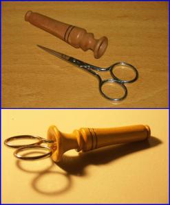 When long evenings call for handywork, a quick spin on the lathe answers with a keep-safe for the tools. This scissors holder is turned from cherry wood.