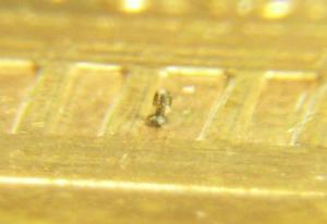 Last night I finished the range of black pieces for the chess set, and for a break I made a quick goblet from the same ebony. With all the practice from making the mini chess set I managed to make it 0.2 mm (0.008″) in diameter, quite a bit smaller again than the previous goblet. The stem is as long as a piece of printer paper is thick: the edge of the paper just fitted in the gap for final polishing. Standing on a US penny for size, its drink volume is just about one-half of a billionth of a litre (one billionth of a pint).