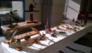 For a recent workplace display, I gathered together the various satellites, rockets, UFOs and other space craft designs that I’d been creating over the years to offer a close-up view of orbiting high-tech. On and around the arched coffee table rest a few models and whimsies and Christmas tree rocket ornaments…