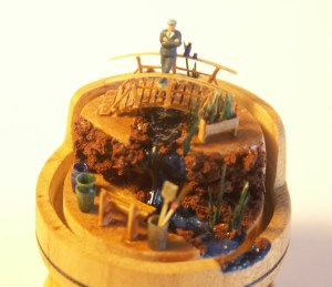 It’s Springtime. The gardener has been busy cleaning up and getting the garden in shape. See him taking a well-deserved rest on the bridge with his thermos and mug of coffee.