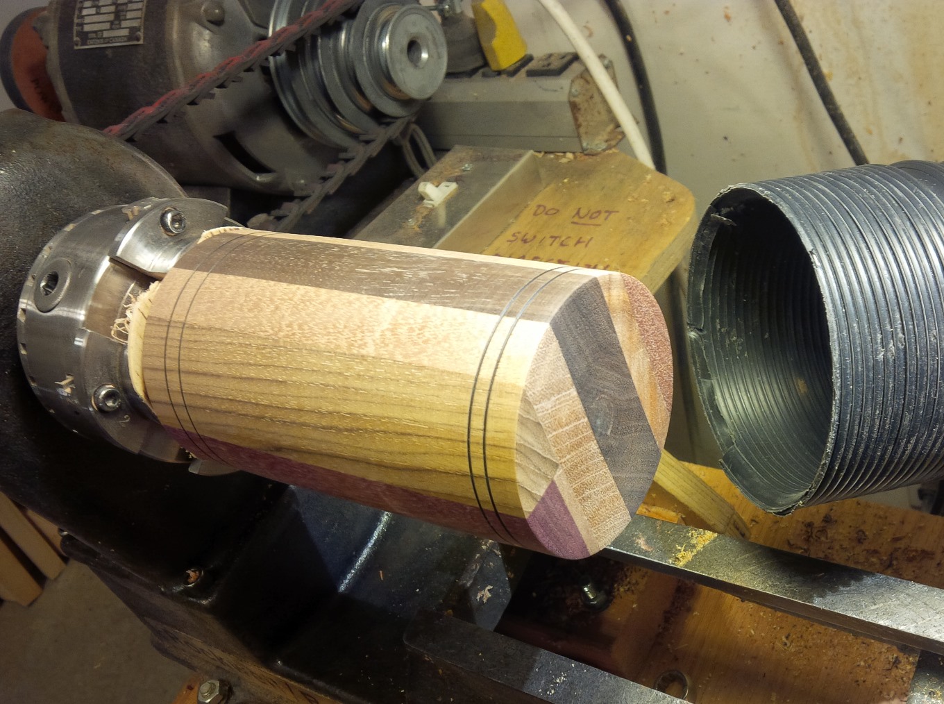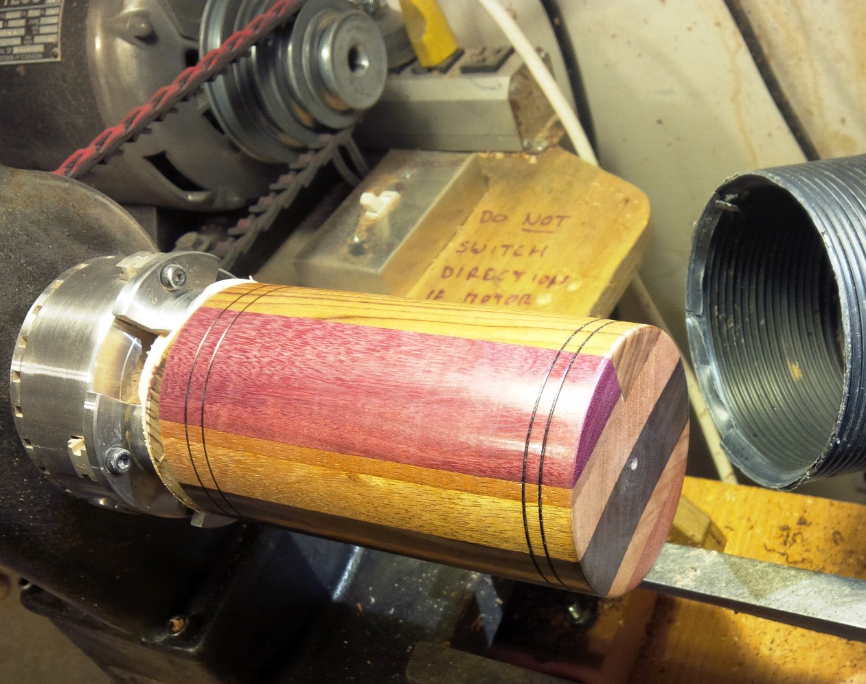 A few revolutions and chisel-slicings later, and here is the main shape in laminated wood sections. About 85 mm, (3.5″) diameter, spot the purpleheart. The rings are burned in with a piece of steel wire, pressing while the wood turns until it starts to smoke.