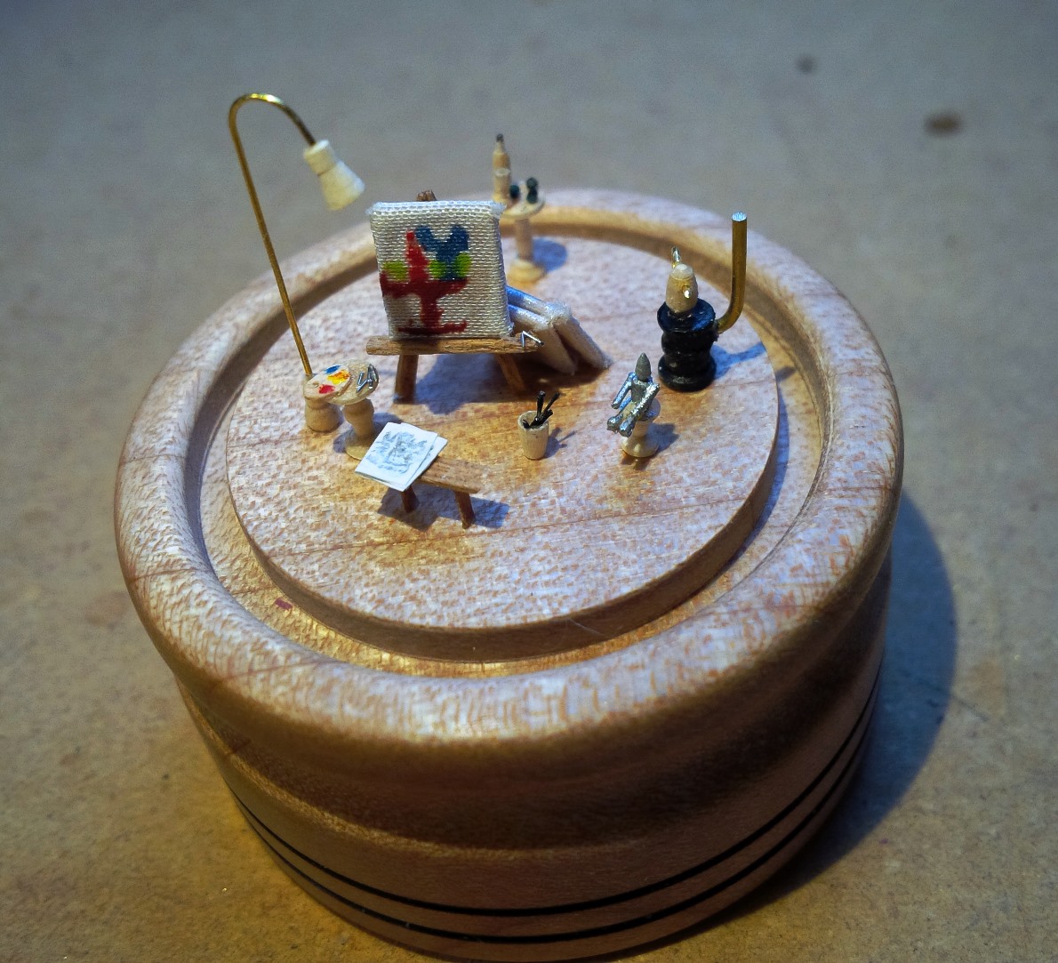 One of the pieces still under construction is this wee art studio (about 25 mm or ~1″ across). If you look closely, you’ll see a little tin man sitting to one side. Whether he is waiting for a miniature oil can or a cup of tea, or whether he’s just pondering life as a still, the storyline is up to you… I invite you to add your suggestion now to grow the contents of this scene, which will be fully updated in the next couple of days.