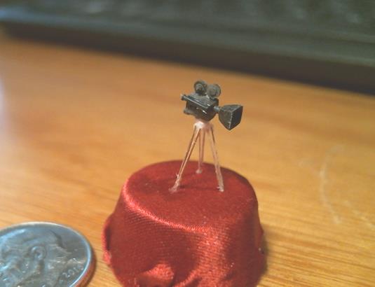 With the cameras rolling, I made the little chess king on my nano-lathe (below). And back in Vancouver, the little 1/144-scale movie camera (above) wound its way to OhMore TV by way of special thanks.